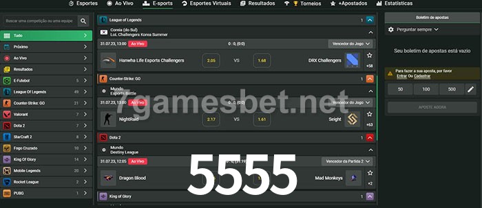 O 5555 oferece uma grande seleção de opções de apostas em e-sports com probabilidades competitivas
